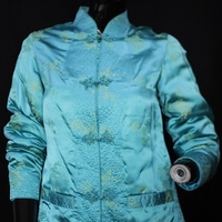 - The jacket is made with brocade silk and is imprinted with flower motifs. The border of the jacket has quilted detailing and includes a Chinese collar. On both reversible sides, there are welt pockets, blue piping details and Chinese buttons as closures. The jacket has slits on the sides of the jackets and is suitable for sizes small and medium. Condition: Good with no visible staining or tears, This is an item from the Post-Graduate Wall, meaning item has been bought or made for a Post-Graduate production. The item cannot be destroyed or adapted as the costume is meant to be preserved following the project.