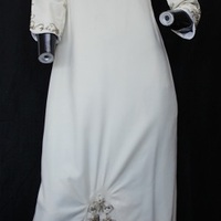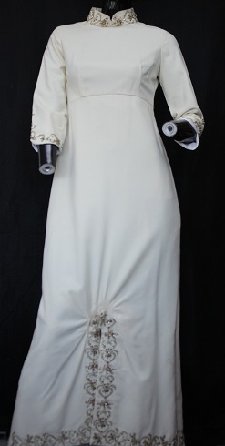 - The ivory white full length dress is made with heavy weight crepe fabric and is lined with white polyester lining. The Chinese collar, hem, and sleeves feature gold tensile embroidery and beading details. The back has a 60cm invisible zipper as a closure and the waist of the dress measures 73cm making the dress suitable for sizes small. The length is the dress is 142cm and has a swoop train of 33cm. Condition: Good with staining in the interior of the dress and has no tears. This is an item from the Post-Graduate Wall, meaning the item has been bought or made for a Post-Graduate production. The item cannot be destroyed or adapted as the costume is meant to be preserved following the project.