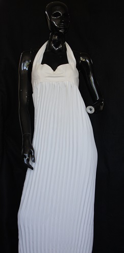 - The white ivory dress is crafted from chiffon and features a sweetheart neckline and a pleated halter strap. The back is partially exposed and has a flat pearl button. The bottom half of the dress includes a pleated skirt and the bust area measures 82cm with the length being 136cm meaning its suitable for sizes small and extra small. Condition: Good with no visible staining or tears. This is an item from the Post-Graduate Wall, indicating that the item has been bought or made for a Post-Graduate production. The item cannot be destroyed or adapted as the costume is meant to be preserved following the project.