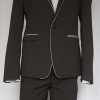 - The grey pinstripe charcoal two piece suit includes a blazer jacket and slim fitting pants. The pants are a size 32 and suitable for sizes small and medium, as they have a waist measurement of 82cm and a length of 108cm. The pants also include a zipper. Fly, belt loops, and piping details on the front and back pockets. The blazer jacket is lined with a black textured satin and has two interior pockets detailed with red piping. The outside of the blazer jacket has two front front pockets with flaps inter-changeable to into welt pockets, it also includes two buttons as closures. Both the Blazer and pants are made with a breathable, lightweight suiting fabric. Condition: Good, with no visible staining or tears. This is an item from the Post-Graduate Wall, meaning it has been purchased or made for a Post-Graduate production. The item cannot be destroyed or adapted as the costume is meant to be preserved following the project.