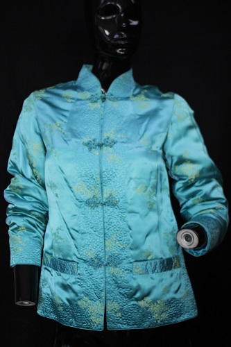 - The jacket is made with brocade silk and is imprinted with flower motifs. The border of the coat has quilted detailing and includes a Chinese collar. On both reversible sides, there are welt pockets, blue piping details and Chinese buttons as closures. The jacket has slits on the sides and is suitable for sizes small and medium. Condition: Good with no visible staining or tears, This is an item from the Post-Graduate Wall, meaning item has been bought or made for a Post-Graduate production. The item cannot be destroyed or adapted as the costume is meant to be preserved following the project.