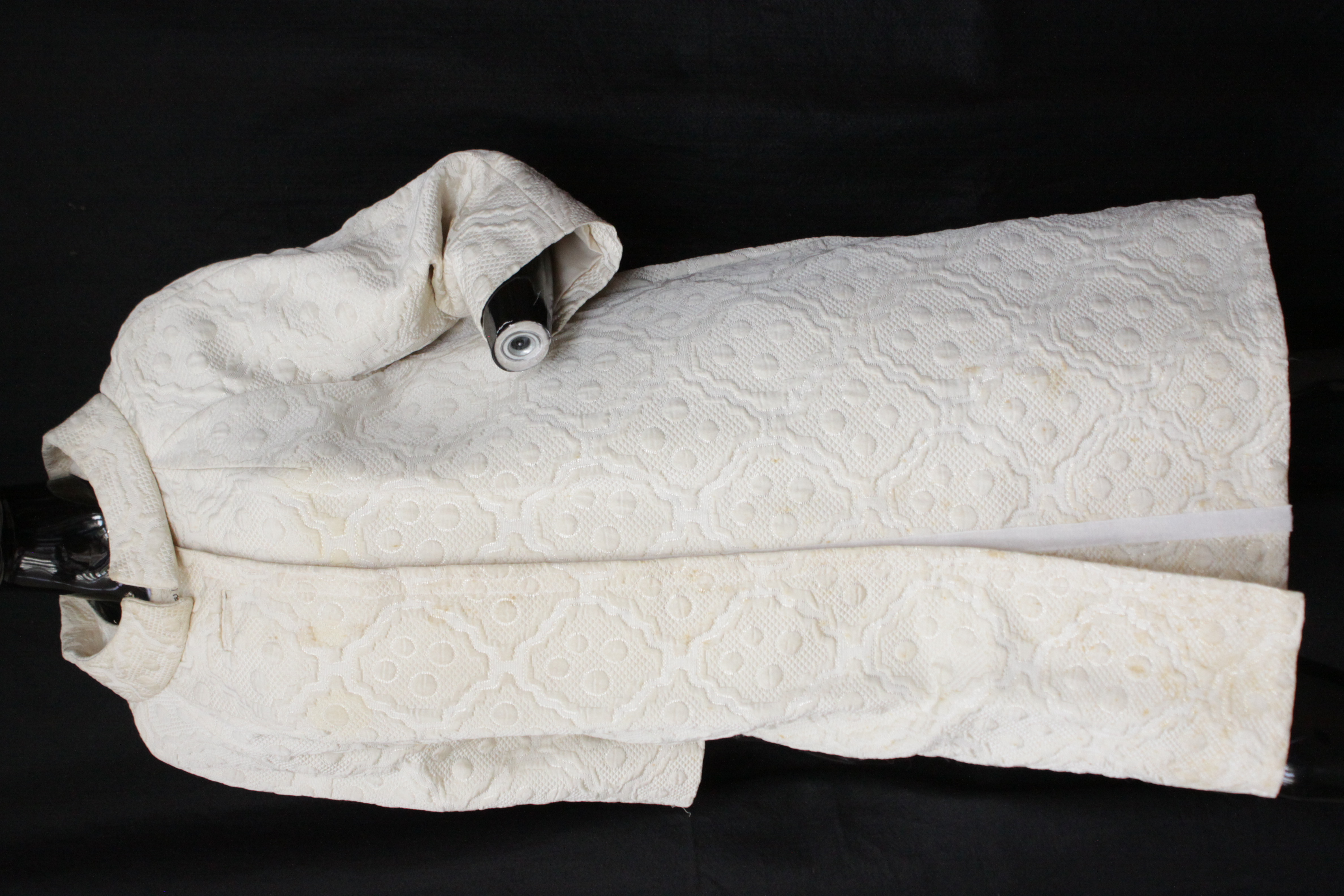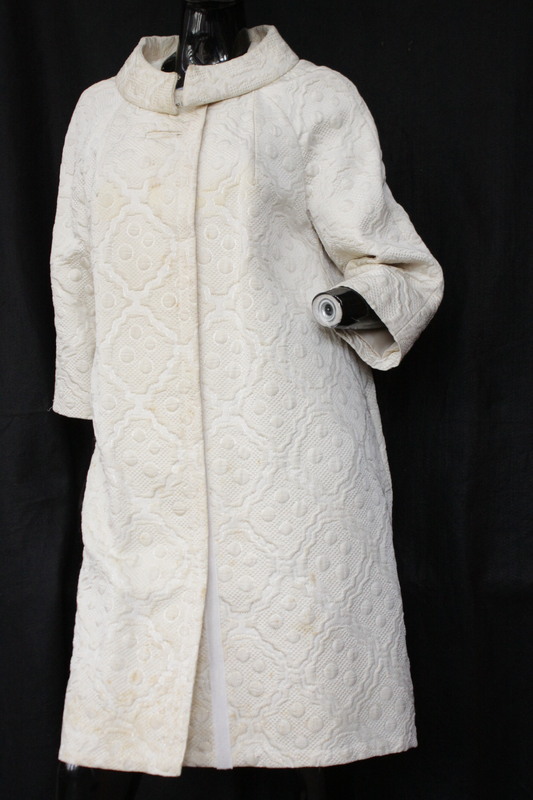 - The white evening coat is made with heavy brocade fabric that has geometric motifs with gold tensile details and three quarter raglan sleeves. The coat includes a shawl collar with hook and eyes in the front closure with a large button hole and a velcro closure from the neckline to the very bottom. The coat include three quarter raglan sleeves and the coat is suitable for sizes large. This kind of silhouette would be worn by the wife of the late President Kennedy, Jacqueline Lee Kennedy Onassis during the 196o's. Condition: Decent with visible staining and no tearing,This is an item from the Post-Graduate Wall, meaning item has been bought or made for a Post-Graduate production. The item cannot be destroyed or adapted as the costume is meant to be preserved following the project.