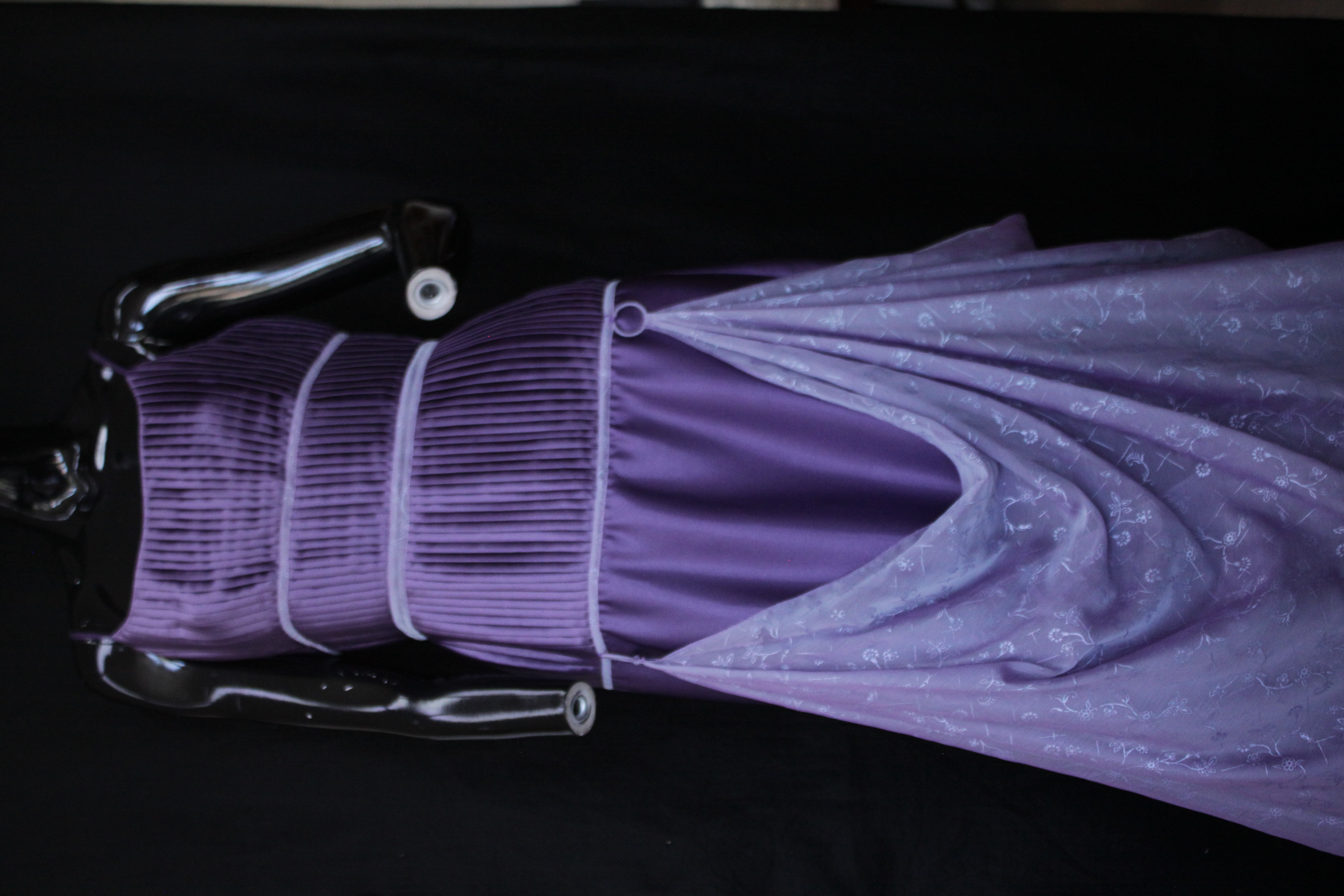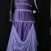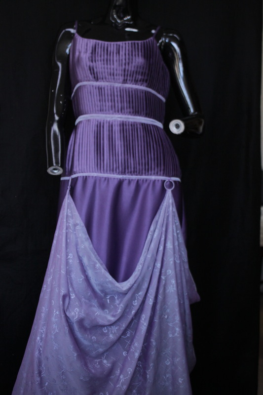 - The ameryst purple dress is made with purple satin fabric and is lined with a magenta nylon. The top halve of the dress has three pleated panels that highlight the bust, waistline and hipline. The three panels include organza bias tape that goes horizontally across the dress. The bottom half of the dress includes draped organza that is draped through three circular loops. The organza features a shiny, flowing motif with imprinted flowers. The back of the dress has a 50cm zipper, a hook and an eye as closure. The waist measures 76cm and has a length of 130cm, making it a suitable size for small. The bodice has has spaghetti straps and one of the straps is torn of and is in need of repair. Condition: Good with no visible staining, with a torn strap. This is an item from the Post-Graduate Wall, meaning the item has been bought or made for a Post-Graduate production. The item cannot be destroyed or adapted as the costume is meant to be preserved following the project.