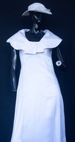 The white maxi-length dress is made with white duchess fabric, which has a shiny appearance. The dress is lined with linen and the interior has bias tape covering the stiches. The top has a carol collar that extends to the back of the dress. The waist measures 70cm, and the length is 144cm, making it suitable for sizes Small and above. Condition: Good with no visible staining or tears, This is an item from the Post-Graduate Wall, meaning item has been bought or made for a Post-Graduate production. The item cannot be destroyed or adapted as the costume is meant to be preserved following the project. -