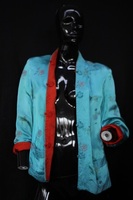 The jacket is made with brocade silk and is imprinted with flower motifs. The border of the jacket has quilted detailing and includes a Chinese collar. On both reversible sides, there are welt pockets, blue piping details and Chinese buttons as closures. The jacket has slits on the sides of the jackets and is suitable for sizes small and medium. Condition: Good with no visible staining or tears, This is an item from the Post-Graduate Wall, meaning item has been bought or made for a Post-Graduate production. The item cannot be destroyed or adapted as the costume is meant to be preserved following the project. -