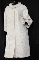 The white evening coat is made with heavy brocade fabric that has geometric motifs with gold tensile details and three quarter raglan sleeves. The coat includes a shawl collar with hook and eyes in the front closure with a large button hole and a velcro closure from the neckline to the very bottom. The coat include three quarter raglan sleeves and the coat is suitable for sizes large. This kind of silhouette would be worn by the wife of the late President Kennedy, Jacqueline Lee Kennedy Onassis during the 196o's. Condition: Decent with visible staining and no tearing,This is an item from the Post-Graduate Wall, meaning item has been bought or made for a Post-Graduate production. The item cannot be destroyed or adapted as the costume is meant to be preserved following the project. -