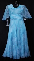 The dress is made from chiffon and features blackout lining. The top is a chiffon overlay has scalloped lace details as well as ribbon details that go horizontally across the dress. The neckline featured is a v-neckline which includes fluttered sleeves that cover the shoulders and the hem has scalloped lace. The length of the dress is 150cm, and the waist is 62cm, making it suitable for sizes Extra Small. The back has a 40cm zipper, hook and eye closures and a fabric button and loop. Condition: Good with no visible staining or tears, This is an item from the Post-Graduate Wall, meaning item has been bought or made for a Post-Graduate production. The item cannot be destroyed or adapted as the costume is meant to be preserved following the project. -