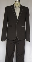 The grey pinstripe charcoal two piece suit includes a blazer jacket and slim fitting pants. The pants are a size 32 and suitable for sizes small and medium, as they have a waist measurement of 82cm and a length of 108cm. The pants also include a zipper. Fly, belt loops, and piping details on the front and back pockets. The blazer jacket is lined with a black textured satin and has two interior pockets detailed with red piping. The outside of the blazer jacket has two front front pockets with flaps inter-changeable to into welt pockets, it also includes two buttons as closures. Both the Blazer and pants are made with a breathable, lightweight suiting fabric. Condition: Good, with no visible staining or tears. This is an item from the Post-Graduate Wall, meaning it has been purchased or made for a Post-Graduate production. The item cannot be destroyed or adapted as the costume is meant to be preserved following the project. -