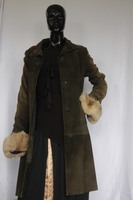The army green coat is made with suede, which is 100% lamb skin, and the cuffs are made with fur from what seems to be fox fur. The coat is lined with black, textured rayon, and is suitable for sizes 12 to 14. The coat has three button holes and only two buttons. This kind of coat is similar to coats that dominate the Y2K aesthetic. Condition: Decent with visible staining and tearing on the cuff and the back armholes. This is an item from the Post-Graduate Wall, meaning the item has been bought or made for a Post-Graduate production. The item cannot be destroyed or adapted as the costume is meant to be preserved following the project. -