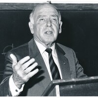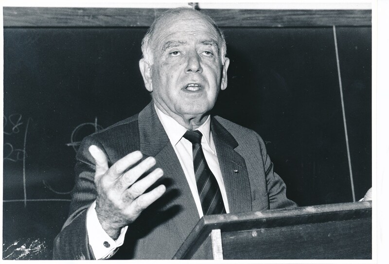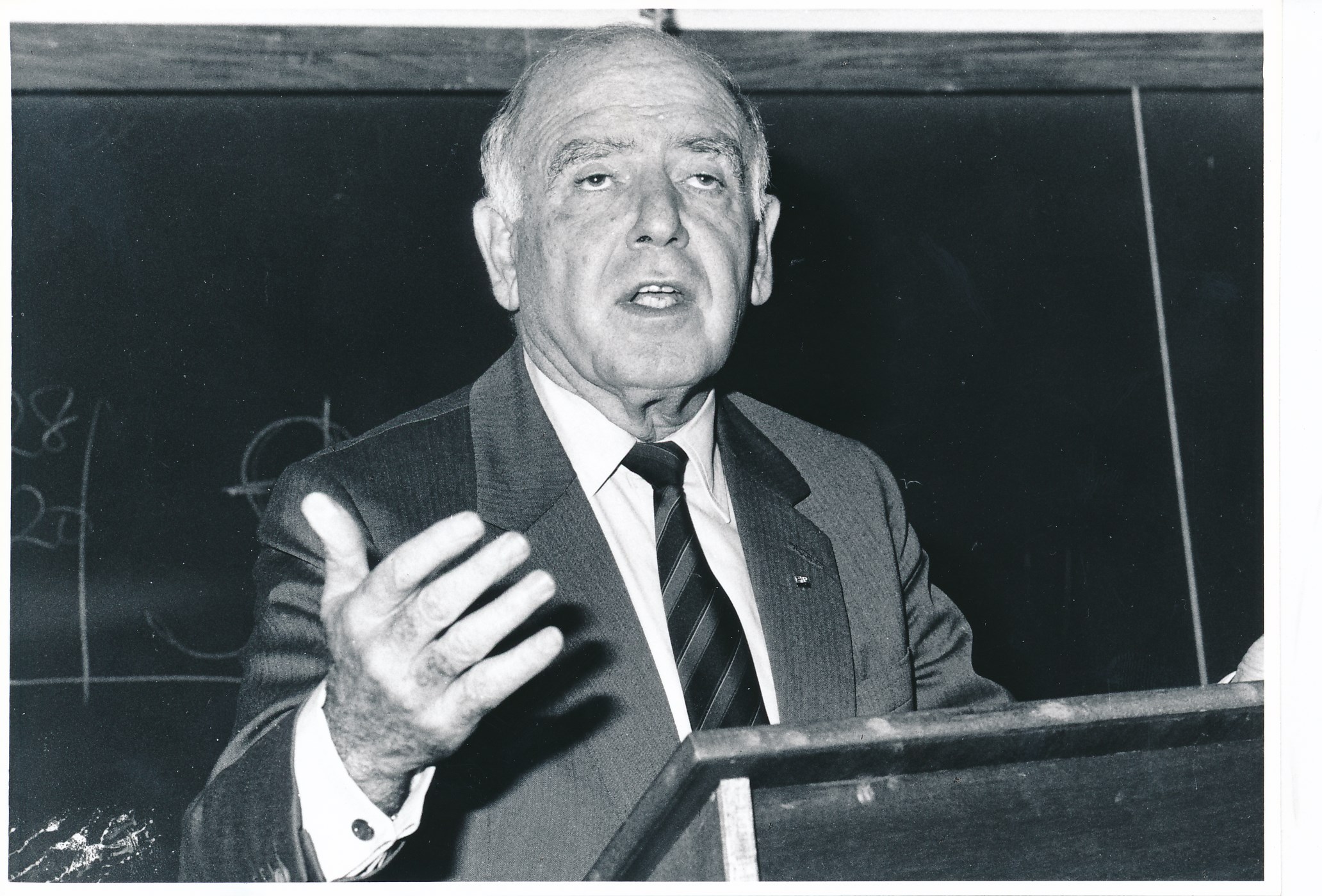 - Photograph of Raymond Ackerman, as a guest lecturer on the principles of good business, at Rhodes University, 14 May 1993.