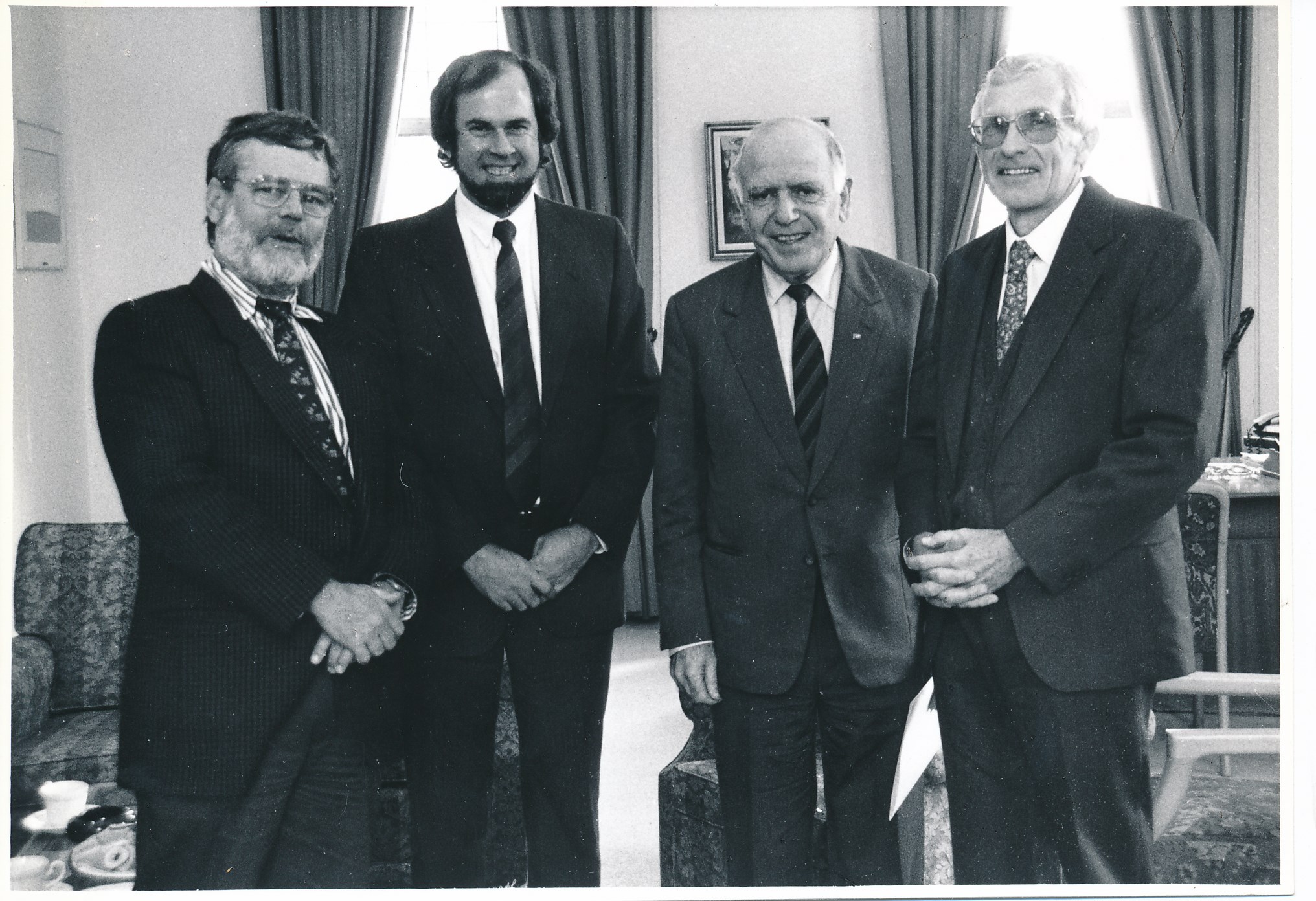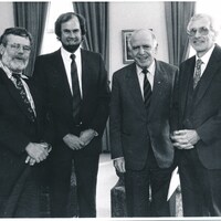 - Photograph of Raymond Ackerman, as a guest lecturer on the principles of good business, at Rhodes University, 14 May 1993. Group photo with Prof. Gavin Stuart, Prof. Gavin Staude.