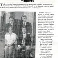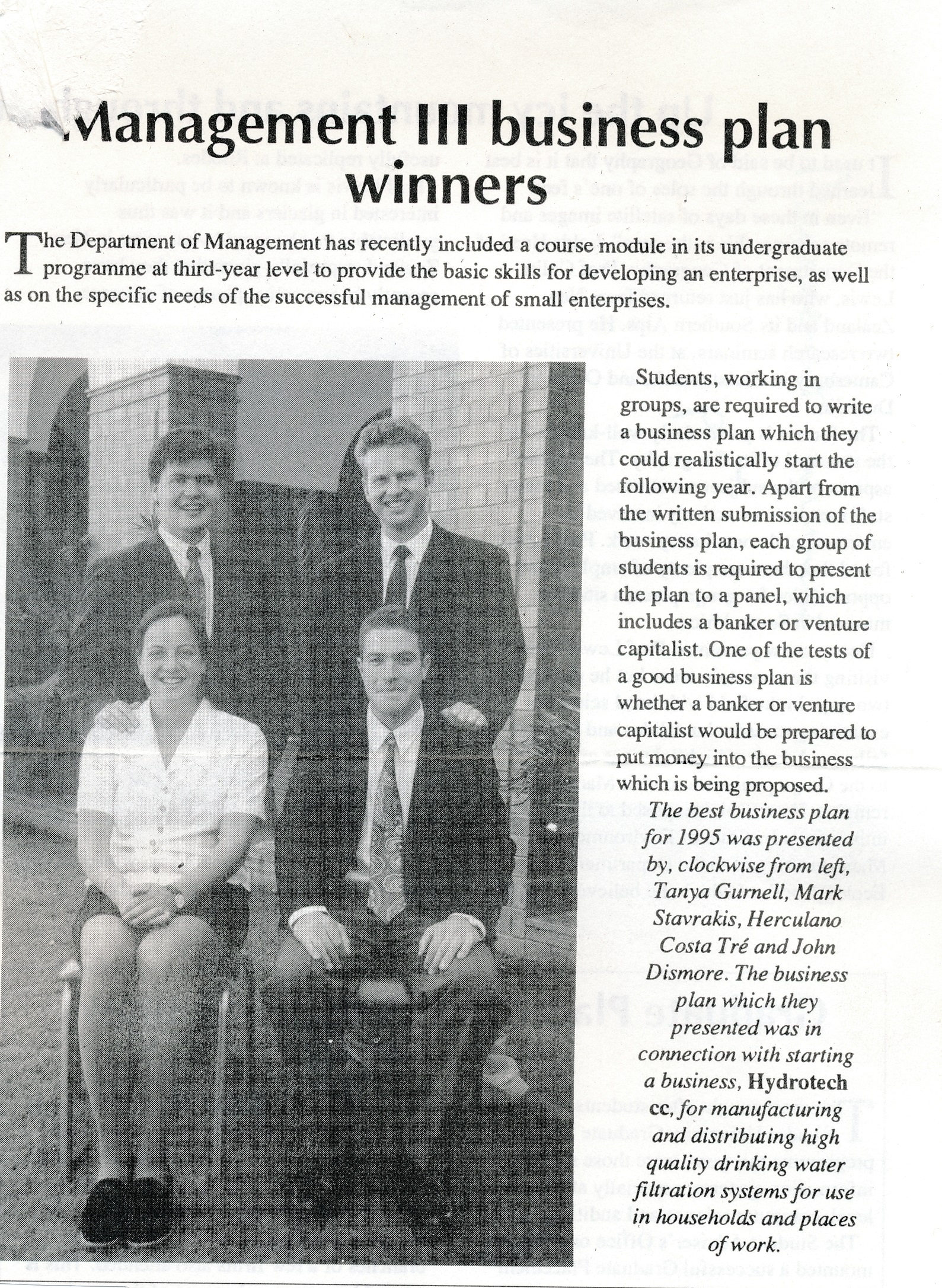 - Photograph of the winners of the Department of Management's (Rhodes University) business plan award. Clockwise from left to right: Tanya Gurnell, Mark Stavrakis, Herculano Costa Tré and John Dismore.