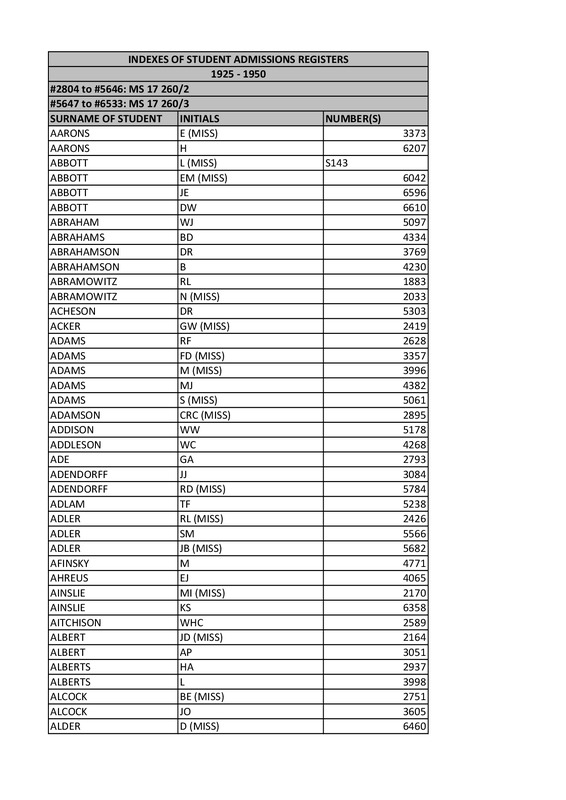 - An alphabetical index of students admitted to Rhodes University between 1925 and 1950, giving the admission number, so that the student's entry may be found in the corresponding MS volume held in the Cory Library.