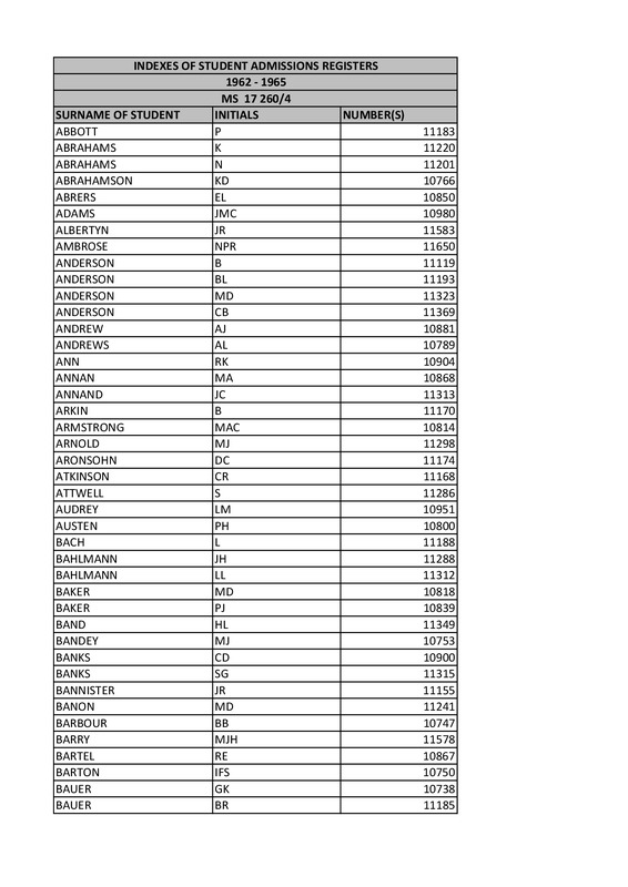 - A list of all students admitted to Rhodes University between 1962 and 1963, arranged alphabetically by surname. Full entries may be looked up in MS 17 260/4, held in the Cory Library.