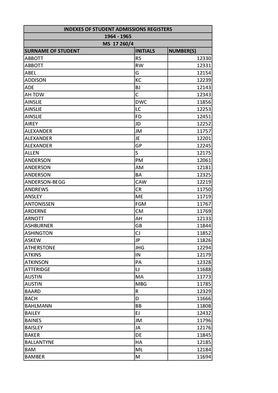 - A list of all students admitted to Rhodes University between 1964 and 1965, arranged alphabetically by surname. The corresponding records may be accessed in the register itself, MS 17 260/4, which is held in the Cory Library.