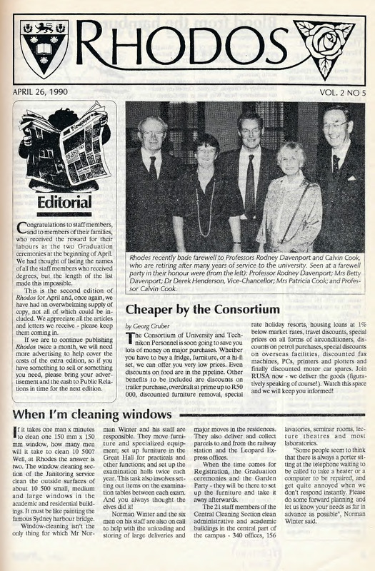 - The Rhodos newsletter carries news and information about events, awards, projects and developments both on and off campus. Ten editions of Rhodos are printed throughout the academic year for distribution among staff members of the University