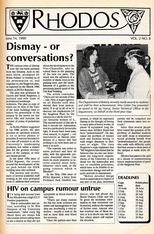 - The Rhodos newsletter carries news and information about events, awards, projects and developments both on and off campus. Ten editions of Rhodos are printed throughout the academic year for distribution among staff members of the University