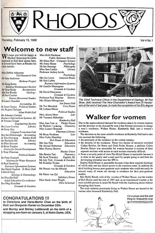- The Rhodos newsletter carries news and information about events, awards, projects and developments both on and off campus. Ten editions of Rhodos are printed throughout the academic year for distribution among staff members of the University