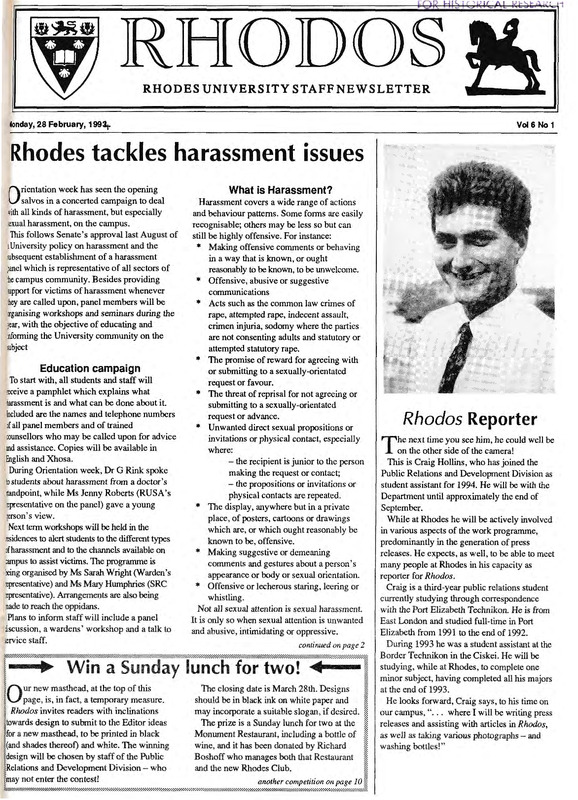 - The Rhodos newsletter carries news and information about events, awards, projects and developments both on and off campus. Ten editions of Rhodos are printed throughout the academic year for distribution among staff members of the University
