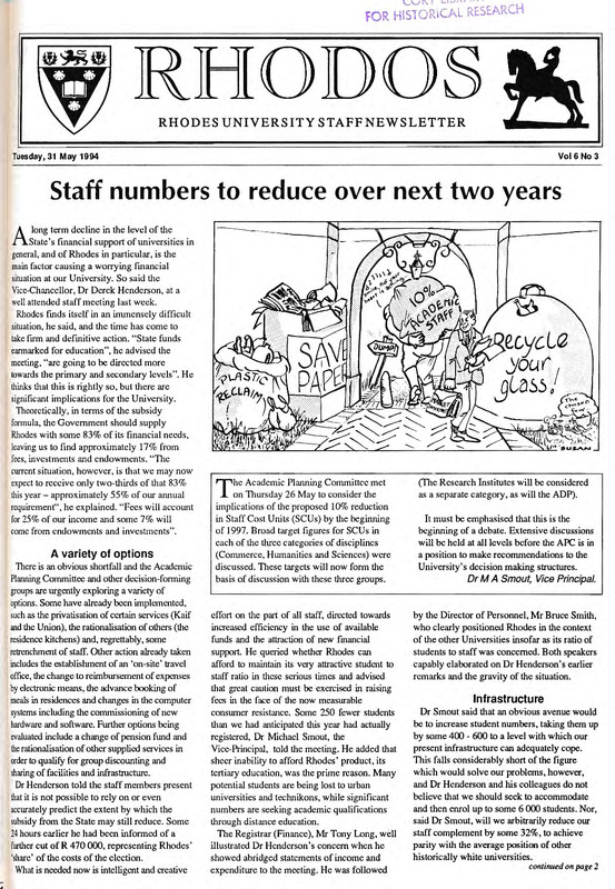 - The Rhodos newsletter carries news and information about events, awards, projects and developments both on and off campus. Ten editions of Rhodos are printed throughout the academic year for distribution among staff members of the University