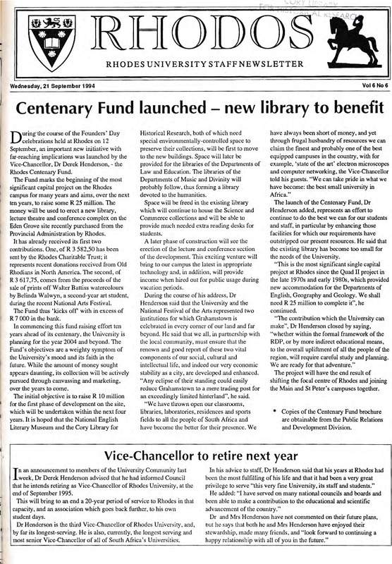 - The Rhodos newsletter carries news and information about events, awards, projects and developments both on and off campus. Ten editions of Rhodos are printed throughout the academic year for distribution among staff members of the University