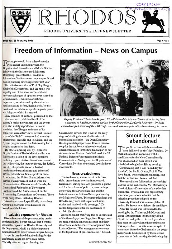 - The Rhodos newsletter carries news and information about events, awards, projects and developments both on and off campus. Ten editions of Rhodos are printed throughout the academic year for distribution among staff members of the University