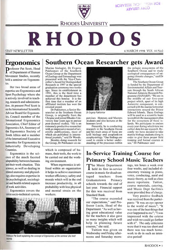 - The Rhodos newsletter carries news and information about events, awards, projects and developments both on and off campus. Ten editions of Rhodos are printed throughout the academic year for distribution among staff members of the University