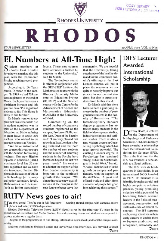 - The Rhodos newsletter carries news and information about events, awards, projects and developments both on and off campus. Ten editions of Rhodos are printed throughout the academic year for distribution among staff members of the University