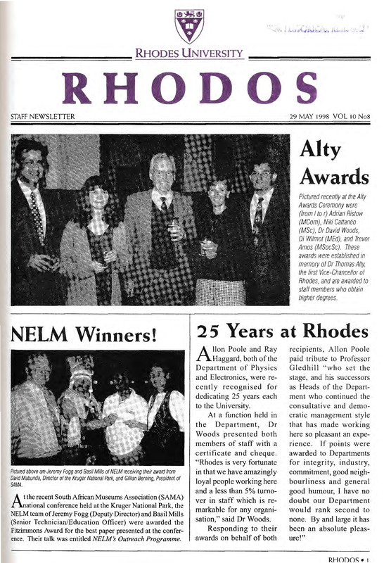 - The Rhodos newsletter carries news and information about events, awards, projects and developments both on and off campus. Ten editions of Rhodos are printed throughout the academic year for distribution among staff members of the University