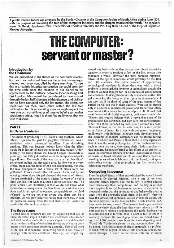 Henderson, Derek Scott, “The computer: servant or master?”, Rhodes University History Archive, accessed 31 December 2025, https://digitalarchives.ru.ac.za/s/ruha/item/15237