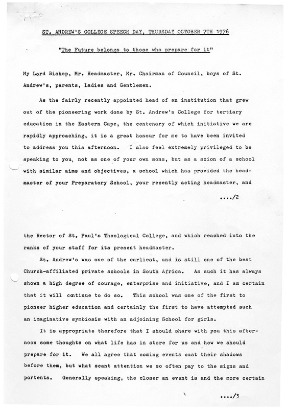 St. Andrews College Speech Day, Thursday October 7th 1976: "the future belongs to those who prepare for it"
