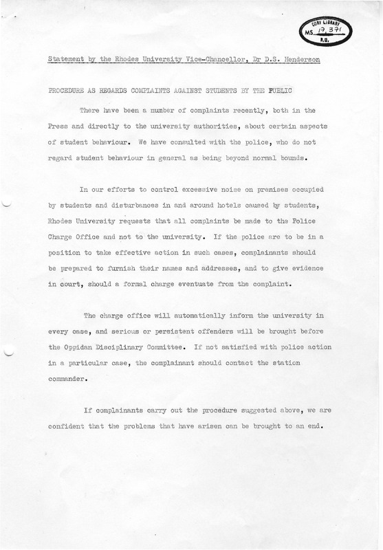 Henderson, Derek Scott, “Procedure as regards complaints against students by the public”, Rhodes University History Archive, accessed 31 December 2025, https://digitalarchives.ru.ac.za/s/ruha/item/15251