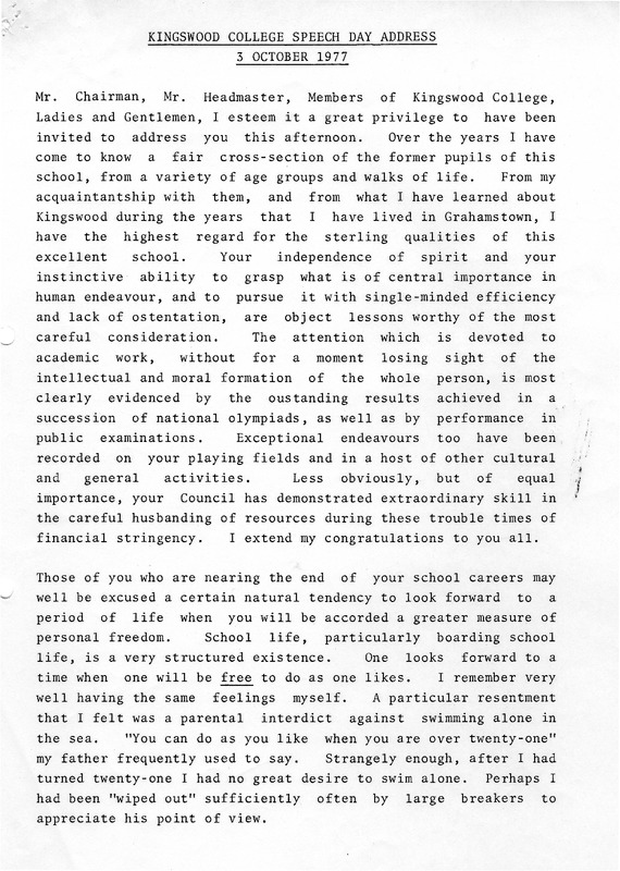 - Kingswood College Speech Day address, 3 October 1977