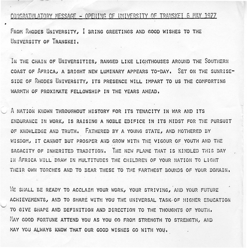 Henderson, Derek Scott, “Congratulatory message: opening of the University of Transkei”, Rhodes University History Archive, accessed 31 December 2025, https://digitalarchives.ru.ac.za/s/ruha/item/15279