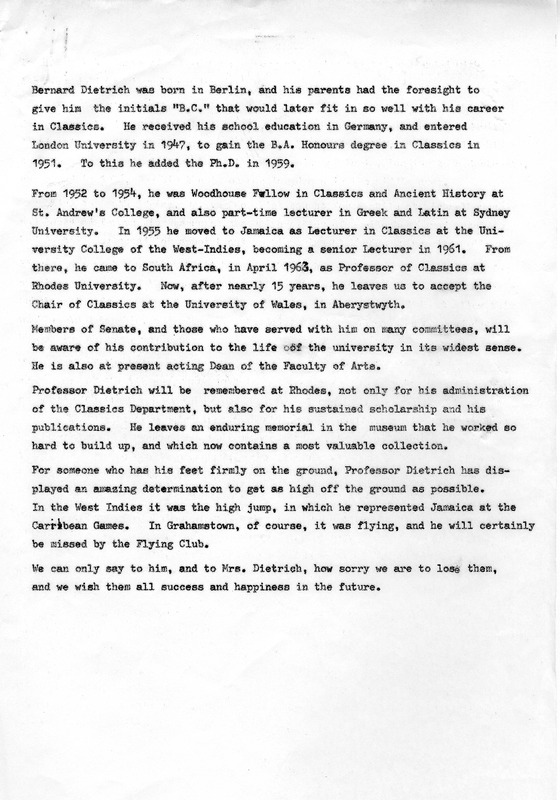 Henderson, Derek Scott, “Farewell dinner for Bernard Dietrich and Frank van der Riet, 6 December 1977”, Rhodes University History Archive, accessed 31 December 2025, https://digitalarchives.ru.ac.za/s/ruha/item/15281