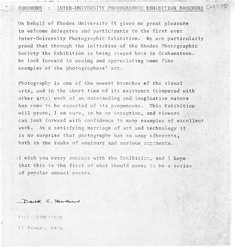Henderson, Derek Scott, “Foreword: inter-university photographic exhibition brochure”, Rhodes University History Archive, accessed 31 December 2025, https://digitalarchives.ru.ac.za/s/ruha/item/15283
