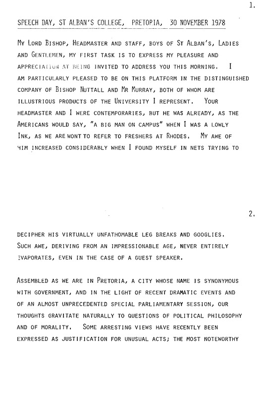 - Speech Day, St. Alban's College, Pretoria, 1978