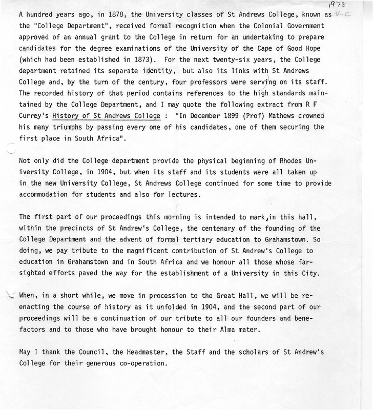 Henderson, Derek Scott, “St. Andrew's College/Rhodes University 100 years”, Rhodes University History Archive, accessed 31 December 2025, https://digitalarchives.ru.ac.za/s/ruha/item/15313