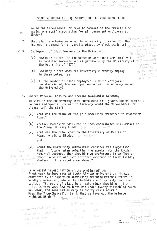 - Rhodes Staff Association : questions for the Vice-Chancellor