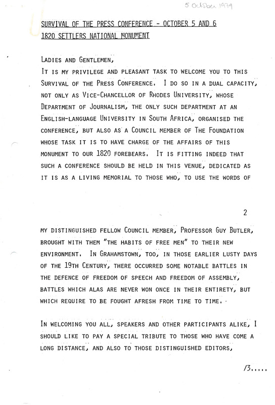 Henderson, Derek Scott, “Welcome to Survival of the Press Conference, 1979”, Rhodes University History Archive, accessed 31 December 2025, https://digitalarchives.ru.ac.za/s/ruha/item/15351