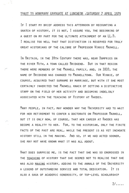 Henderson, Derek Scott, “Toast to honorary graduates at luncheon, graduation 1979”, Rhodes University History Archive, accessed 31 December 2025, https://digitalarchives.ru.ac.za/s/ruha/item/15355