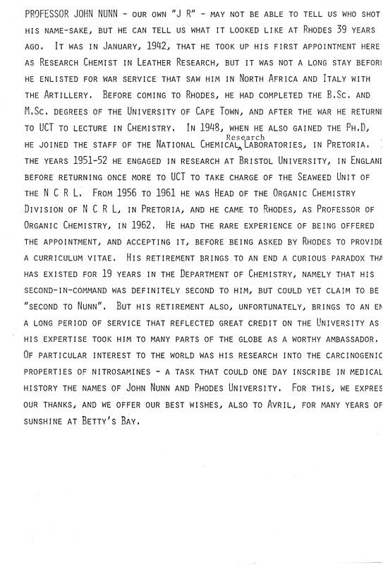 Henderson, Derek Scott, “John Nunn retirement”, Rhodes University History Archive, accessed 31 December 2025, https://digitalarchives.ru.ac.za/s/ruha/item/15393