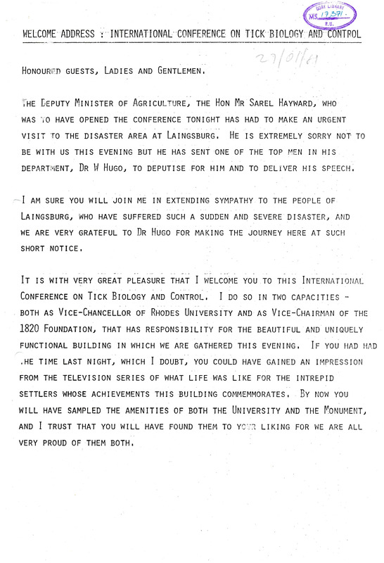 Henderson, Derek Scott, “Welcome address: International Conference on Tick Biology and Control”, Rhodes University History Archive, accessed 31 December 2025, https://digitalarchives.ru.ac.za/s/ruha/item/15407