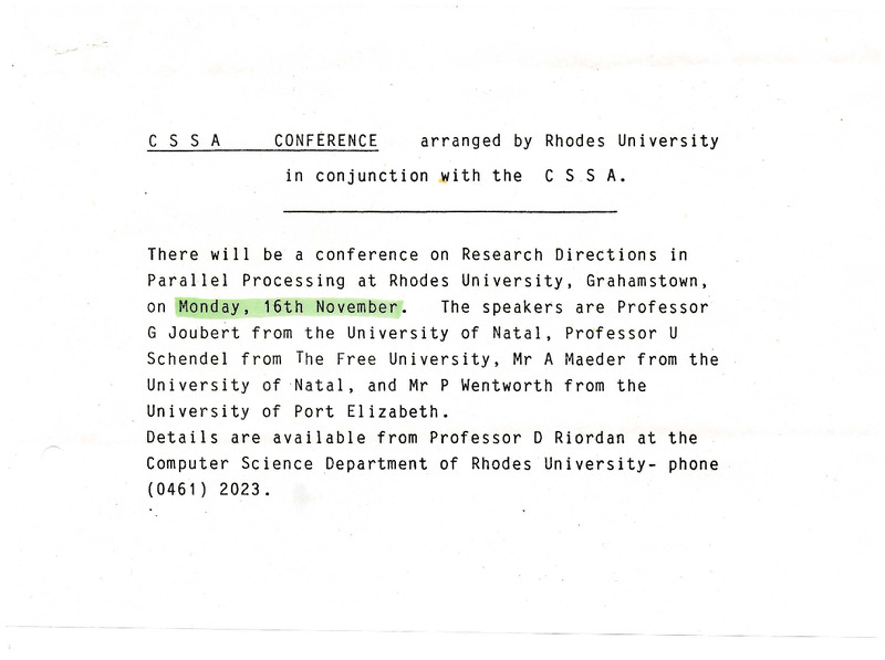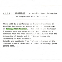 Henderson, Derek Scott, “CSSA Conference: research directions in parallel processing”, Rhodes University History Archive, accessed 31 December 2025, https://digitalarchives.ru.ac.za/s/ruha/item/15443