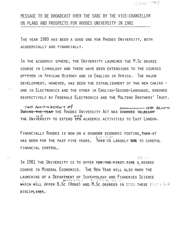 - Message to be broadcast over the SABC by the Vice-Chancellor on plans and prospects for Rhodes University in 1981