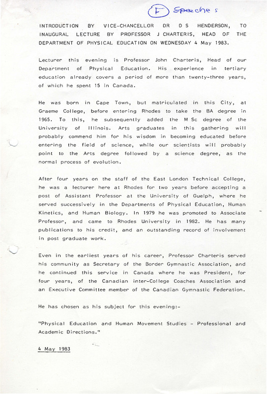 - Introduction by VC Dr D.S Henderson to inaugural lecture by Professor J Charteris, Head of the Department of Physical Education