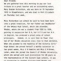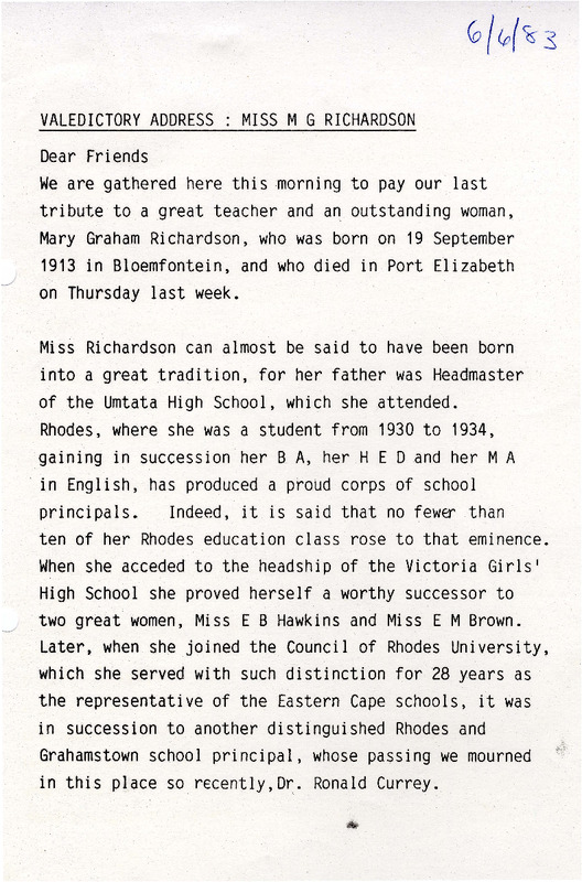 Henderson, Derek Scott, “Valedictory address: Miss M.G Richardson”, Rhodes University History Archive, accessed 30 December 2025, https://digitalarchives.ru.ac.za/s/ruha/item/15469