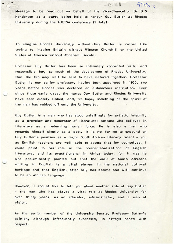 Henderson, Derek Scott, “Message to be read out on behalf of the VC at a party being held to honour Guy Butler at Rhodes University during the AUTESA Conference”, Rhodes University History Archive, accessed 30 December 2025, https://digitalarchives.ru.ac.za/s/ruha/item/15471