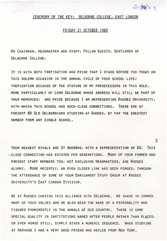 Henderson, Derek Scott, “Ceremony of the key: Selborne College, East London”, Rhodes University History Archive, accessed 30 December 2025, https://digitalarchives.ru.ac.za/s/ruha/item/15479
