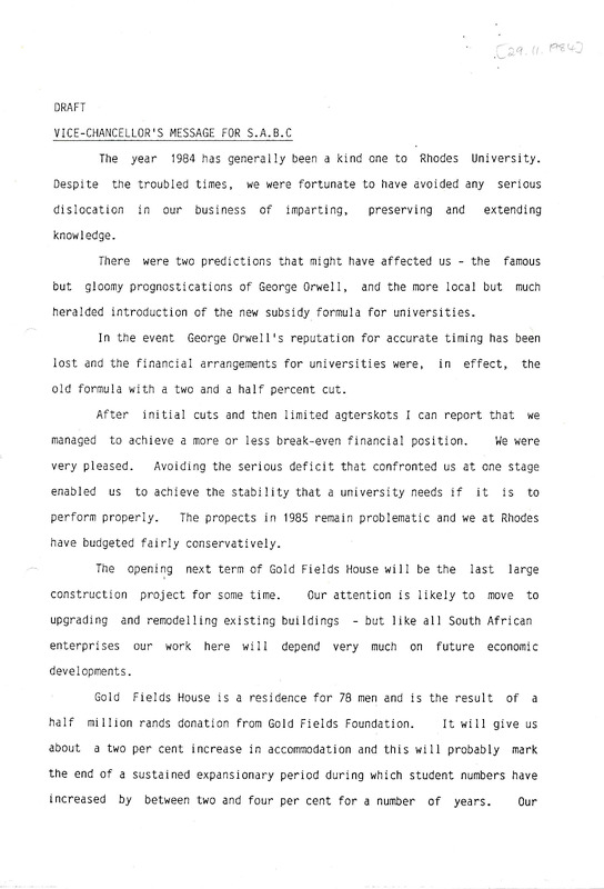 Henderson, Derek Scott, “Vice-Chancellor's message for S.A.B.C (draft)”, Rhodes University History Archive, accessed 30 December 2025, https://digitalarchives.ru.ac.za/s/ruha/item/15503